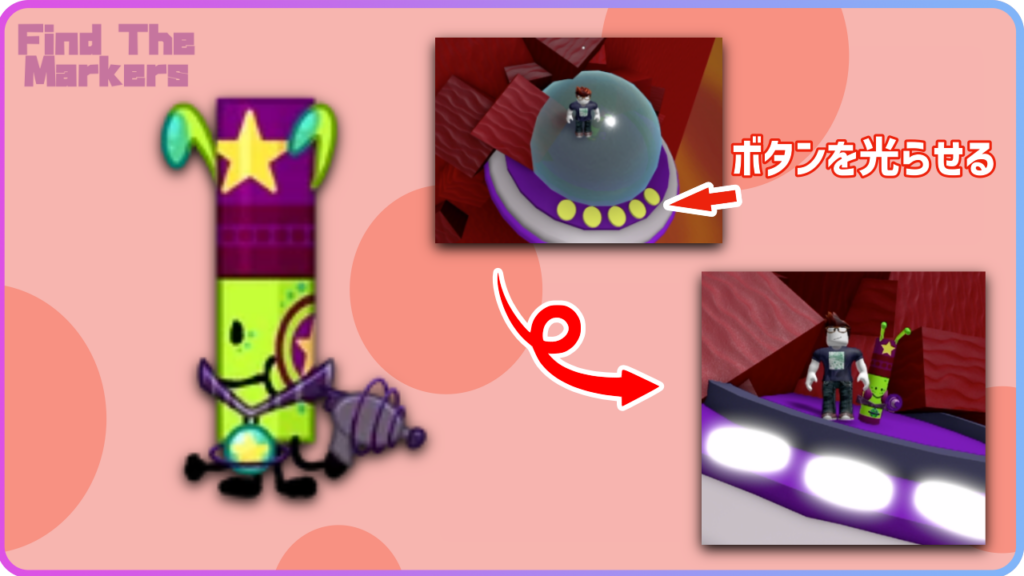 火星ステージにてステージの端の方にUFOがあります。5つのボタンを押してすべて光らせることが出来たら中にAlien Markerがあります。(ボタンを押す順番の法則性は現在のところわかっていません)