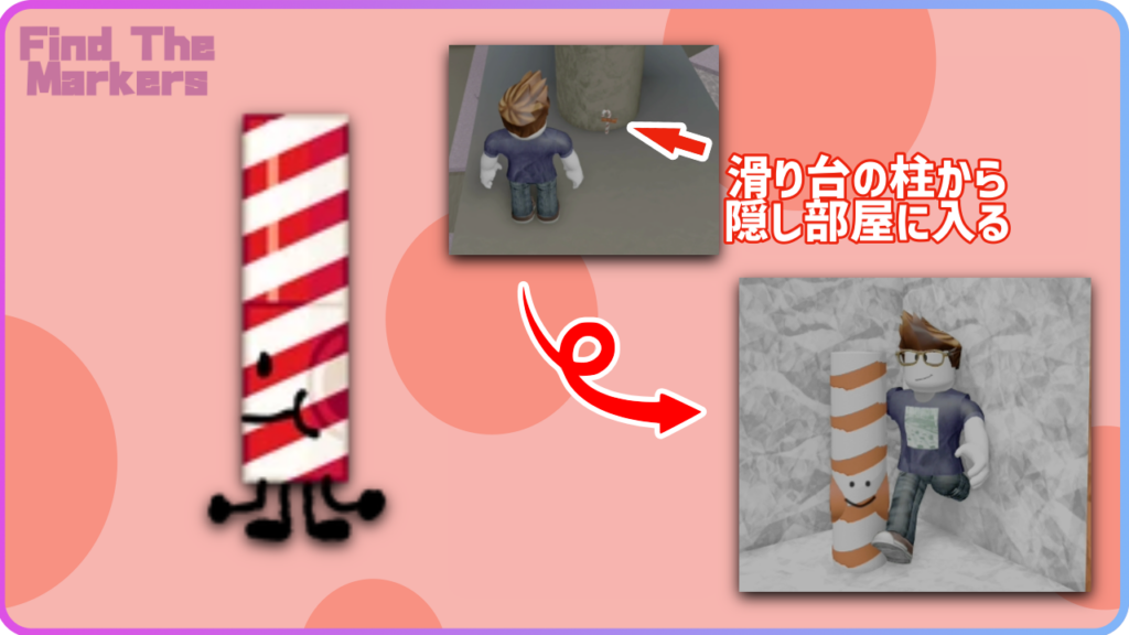 キャンディーランドエリアの滑り台の真下、ピンクのキャンディーから棒を伝って上に行くと隠し部屋にあります。