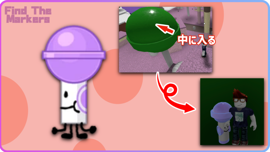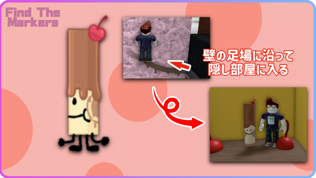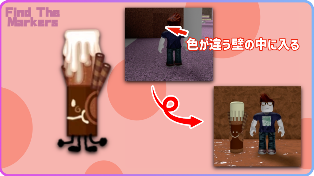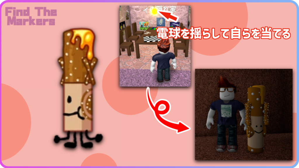 キャンディーランドエリアの 建物の中の電球に触れて揺らします。揺れた電球に自らを当てに行って、チョコレートの川の方に飛ばされます。そのまま流れに身をまかすとマーカーを見つけることができます。