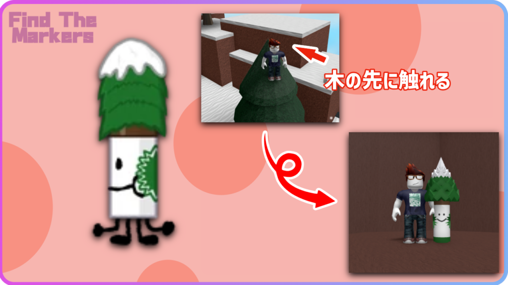 雪エリアの木の頂上に登ります。 (工場エリアに近い木の上です)木の先に触れると隠しアスレチックエリアに移動するので、その頂上にあります。