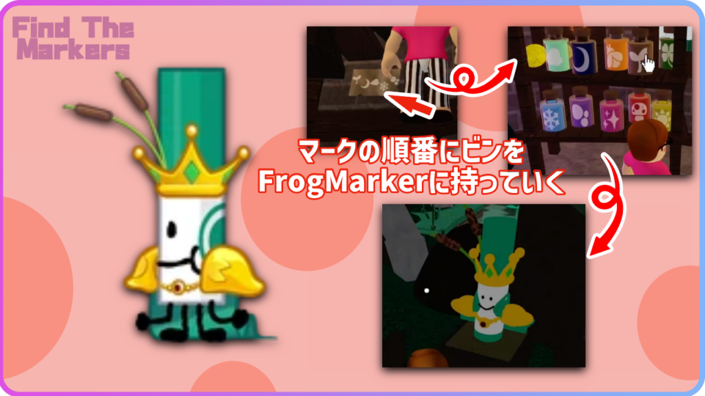 ウォッシャブルキングダムステージの沼地にある塔のような建物の中、1階の壁に描かれたマークの順番を確認します。2階にあるマークが描かれた瓶を1階で見たマークの順番にFrogMarkerのところ持って行き瓶の中身を振りかけます。すべてのマークを順番通りに振りかけることが出来たらなFrogMarkerがPrincceMarkerに変化します。