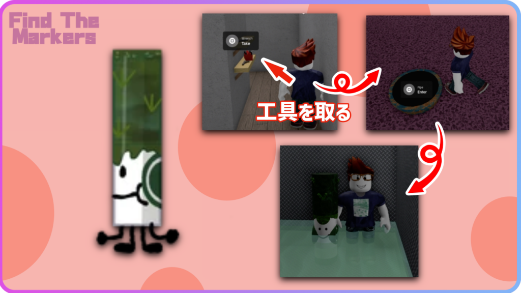 まず、時計台裏右側の建物で工具を入手します。その後、ショップ前の水中の中の排水溝を工具を使って開けます。その中の道の先にあります。