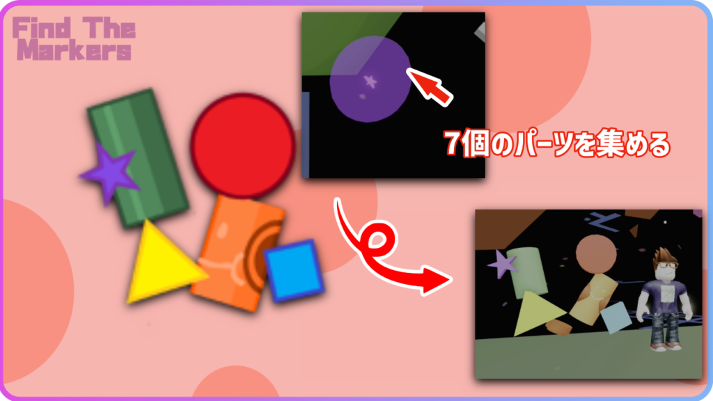 センテッドレヴェリーステージの赤い扉の中、宇宙エリアにて。球体に包まれたパーツを7個集めます。その後、入り口付近にShape Markerが出現します。