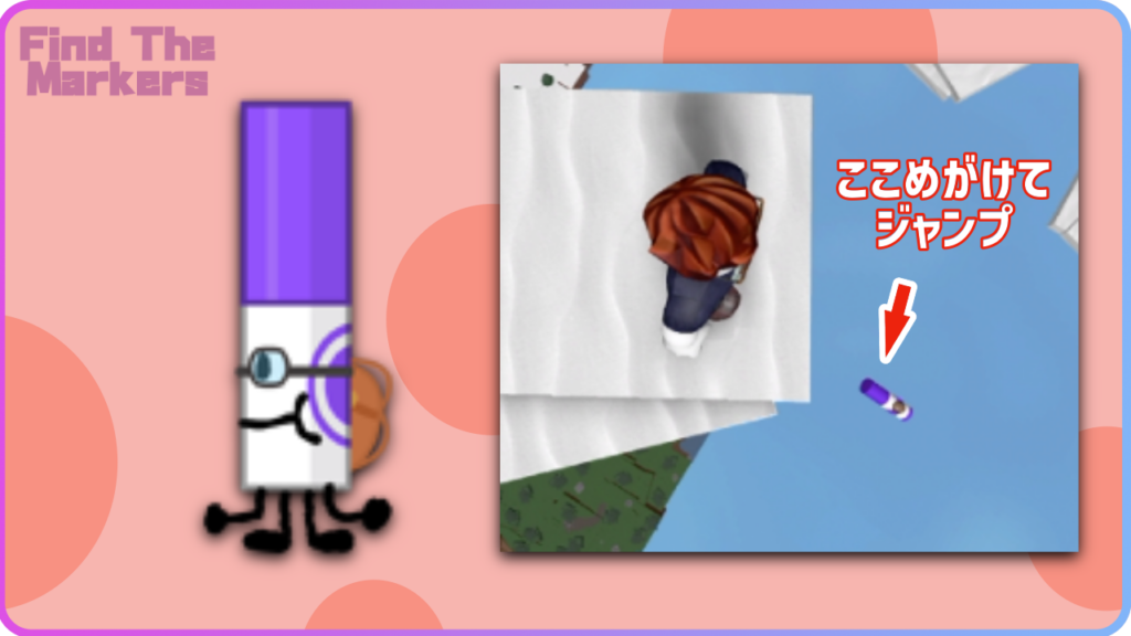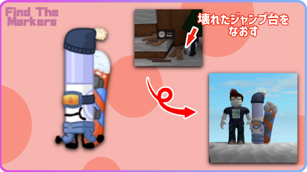 山エリアの山頂付近にて、壊れたジャンプ台を修復後、山頂から空中の円に向かってジャンプをします。円の中に入ることが出来たらSnowboard Markerが山頂に出現します。