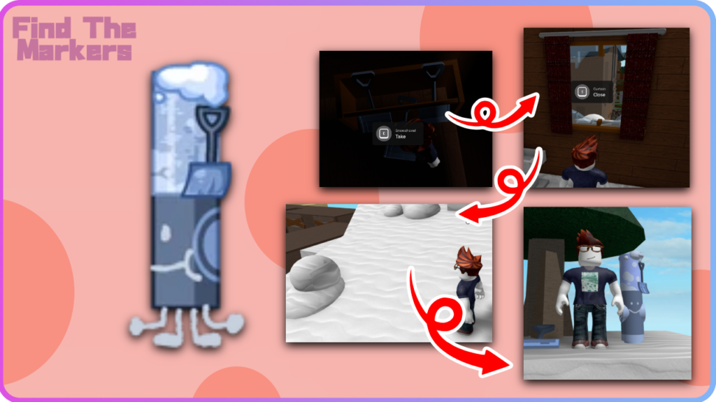 雪エリアの建物にて、1階にあるショベルを手に取り、2階のバスルームの窓を割ります。外に出て雪かきゲームをクリアすると、スノーショベルマーカーのある場所に移動します。