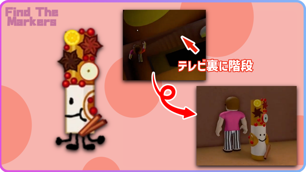 キャンディーランドエリアのお菓子の家のテレビを見ます。砂嵐の画面になった瞬間にボタンを押す、またはタップすると隠し部屋に移動できるのでそこあります。